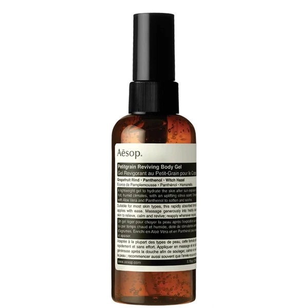 Soothe and refresh sun-kissed skin with the Petitgrain Reviving Body Gel from luxury Australian skincare brand Aesop. Delivering an uplifting citrus fragrance, the lightweight, hydrating gel is ideal for cooling the skin in humid climates or after exposure to the sun. Combining skin-softening Aloe Vera, Witch Hazel and Panthenol with extracts of Grapefruit, Lemon and Petitgrain to calm and cool, the gel is suitable for most skin types.