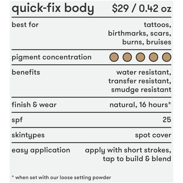 Without leaving skin cakey, the hydrating formula offers long-lasting results that are smudge and transfer resistant. Expect exceptional coverage for up to 16 hours*. Hack: Quick Fix™ Body can also be used as a body contour stick!