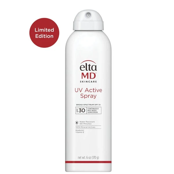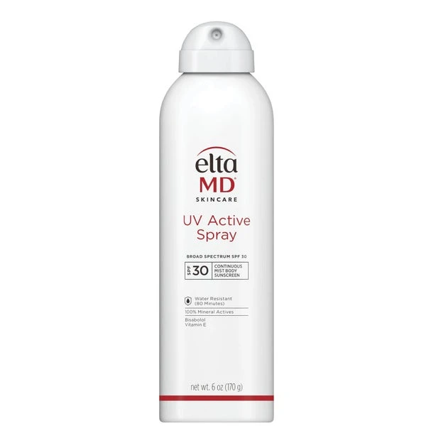EltaMD UV Active Spray SPF 30 is a water- and sweat- resistant sunscreen formulated for an active lifestyle. It’s a 100% Zinc Oxide mineral sunscreen that offers 80 minutes of water resistance for long-lasting and reliable protection. Enriched with bisabolol to help calm skin and visibly reduce the appearance of redness.