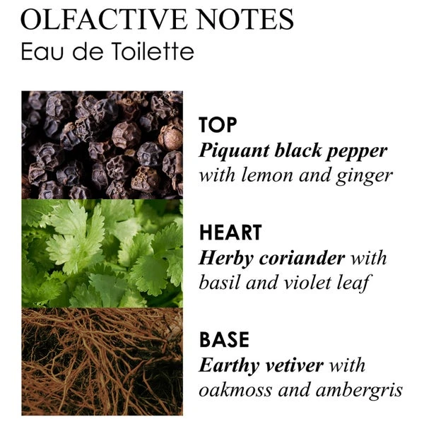 Invigorate your senses with the Molton Brown Re-Charge Black Pepper Eau de Toilette. This bold Eau de Toilette opens with energetic top notes of Black Pepper, Lemon and Ginger. A herbal heart of Coriander, Basil and Violet leaf adds a luscious botanical accord that descends into a woody base of Vetiver, Oakmoss and Ambergris.