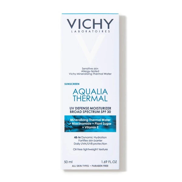 Aqualia Thermal UV Defense Moisturizer Sunscreen provides long lasting 48 hour dynamic hydration, smoothed fine lines, and daily SPF 30 protection from harmful UVA/UVB rays, which can cause skin damage and premature skin aging. Formulated with Vichy Mineralizing Water from the French volcanoes to fortify the skin barrier and protect it from daily exposome factors like lack of sleep, stress, and pollution, which can cause up to 80% of skin aging. This oil-free, refreshing lightweight texture glides easily over skin without stickiness. Skin appears less tired, leaving a healthy looking radiance. Paraben-free, oil-free, and non-comedogenic.
